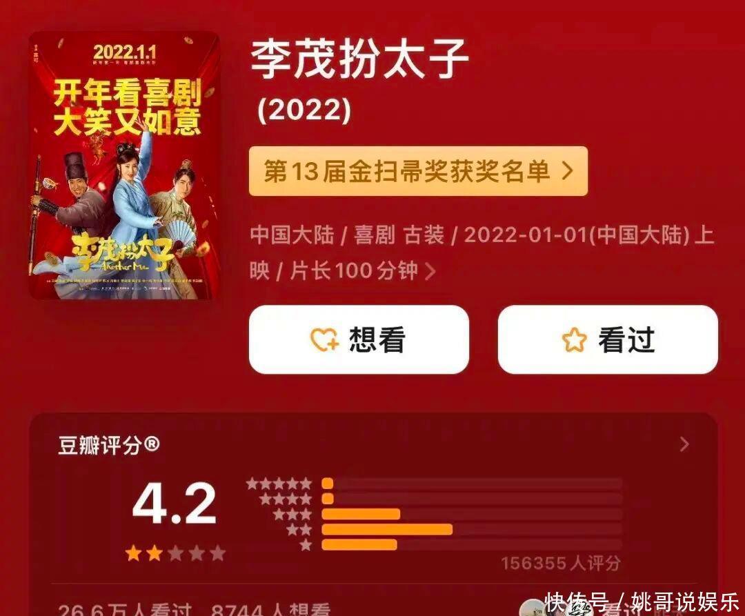 不过要说句公道话,《热辣滚烫》的票房没算在马丽名下。但她主演的大量角色,纯粹是大男主的附属—— 负责搞笑、吃醋、吵架、辅助男主,并无独立人格与叙事线。而且这些角色同质化、刻板化,多为咋咋呼呼的妻子或母亲,角色深度与复杂度不足。票房虽然登顶,但马丽的代表作、经典角色、艺术成就未同步,看上去就像票房巨人、角色侏儒。支撑马丽的核心高票房作品,如《夏洛特烦恼》《羞羞的铁拳》《独行月球》,均与沈腾搭档,靠的是 “沈马CP”红利,而非个人号召力。她单飞的作品,基本上口碑崩盘。譬如独自挑大梁的《这个杀手不太冷静》、《水饺皇后》,均豆瓣6.1分。《李茂扮太子》这些更是低到3分4分了。